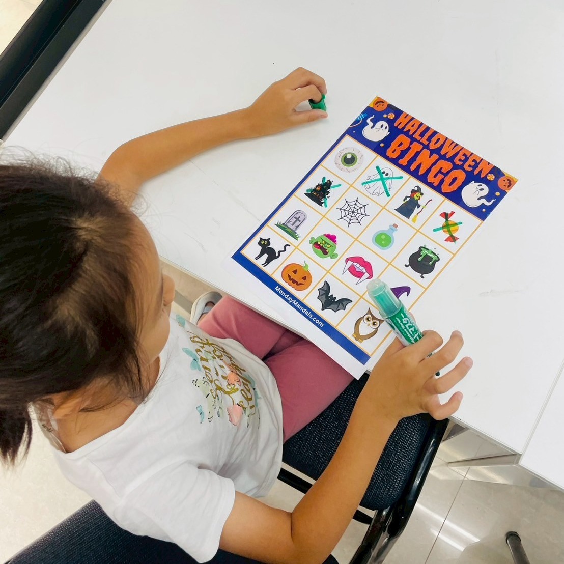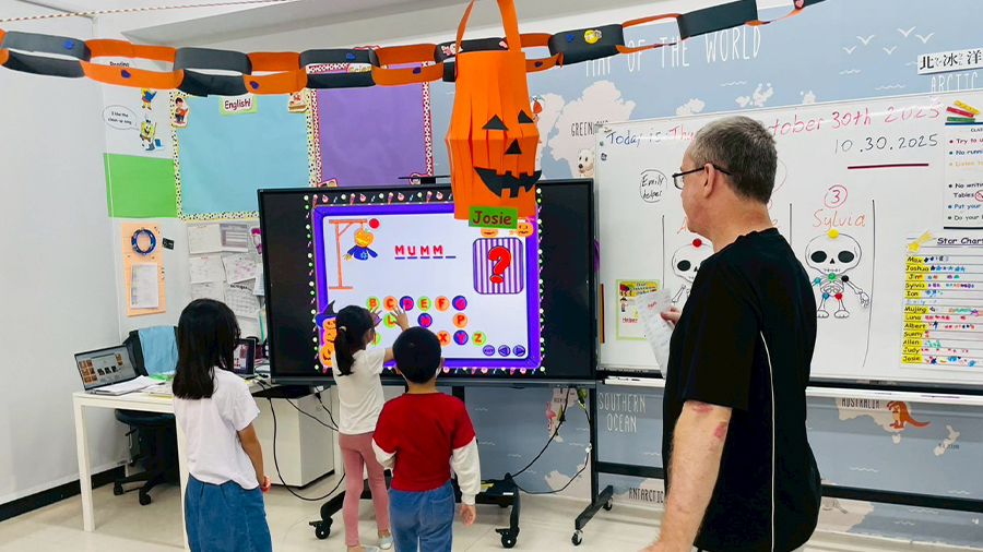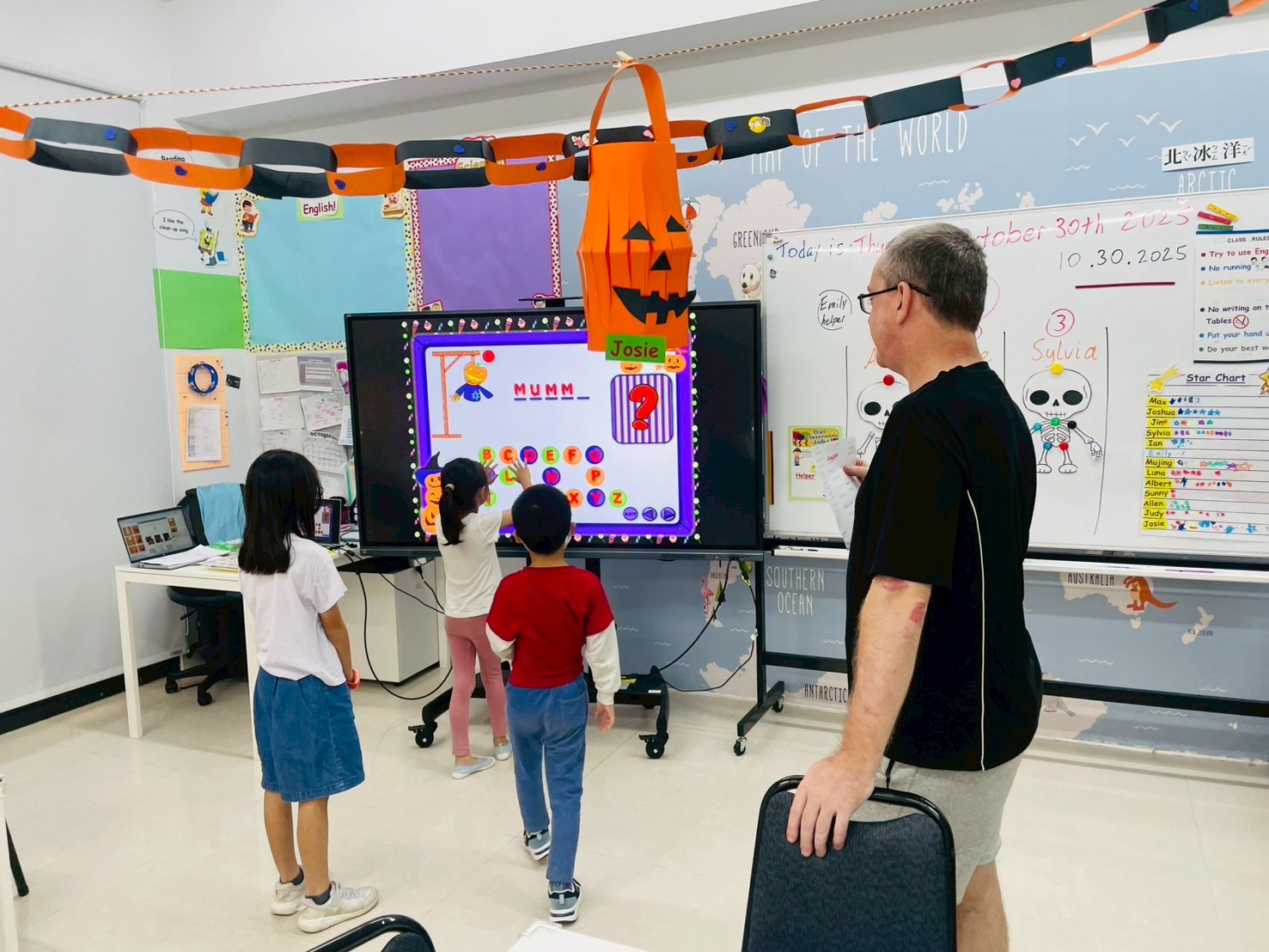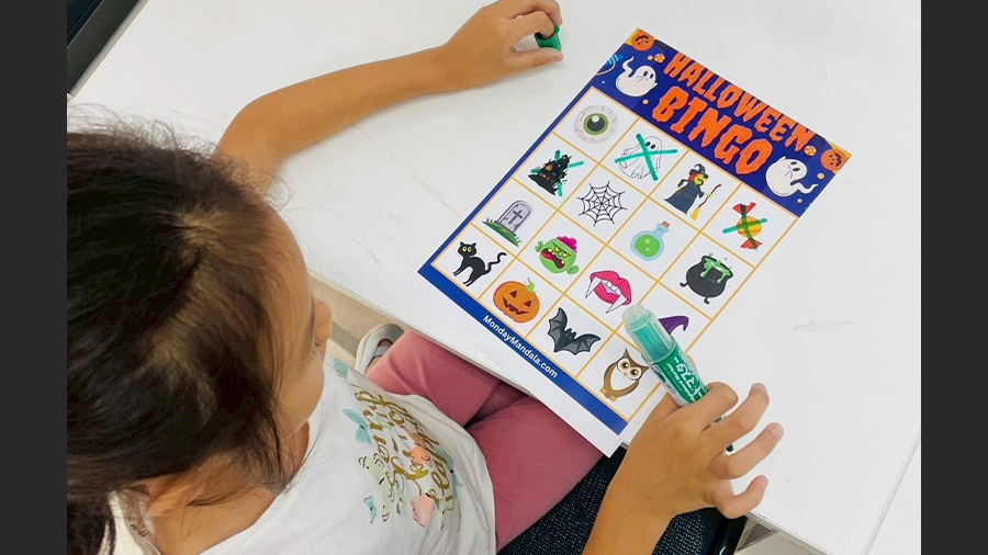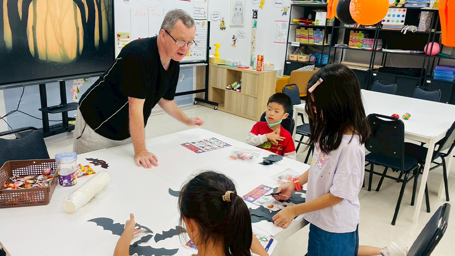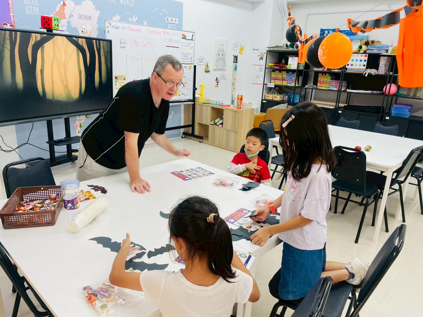 外師用心佈置出滿滿萬聖節氛圍的教室,蝙蝠藏在角落、陰森的配樂、燈光~讓人為之一亮。孩子們開心參加「尋找蝙蝠」、BINGO 挑戰、英文小遊戲,各種驚奇陪伴大家度過這個特別的萬聖節。