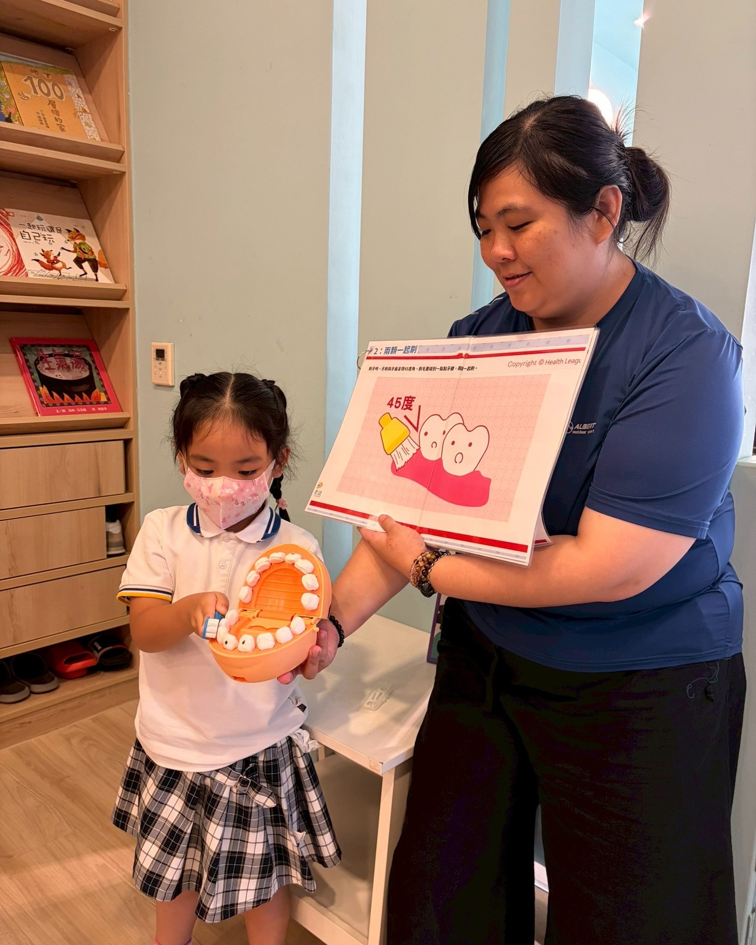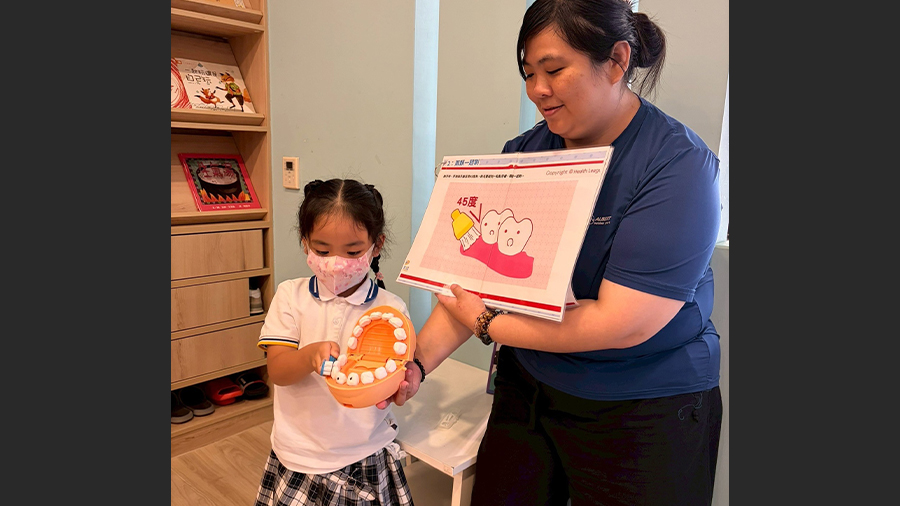 老師透過大牙模型教學,示範正確的刷牙方式,包含「口訣321」,並宣導使用牙線,幫助孩子建立健康的刷牙習慣。